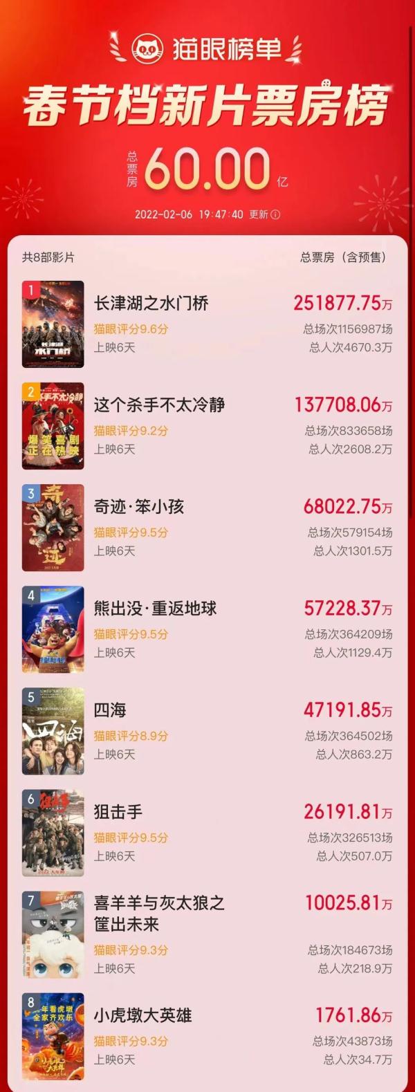 另外据猫眼专业版数据,自大年初一上映以来,截至2022年2月6日19时47分,2022春节档新片总票房(含点映)破60亿,位列中国影史春节档总票房第二,春节档期总场次刷新春节档期场次纪录。